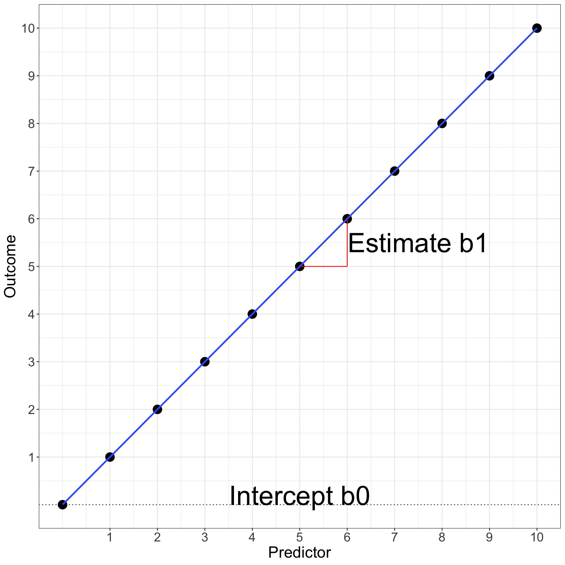 the estimate coefficient\(b_{1}\) (i.e., how much the Outcome increases when the Predictor increases by 1) which is 1 in our case