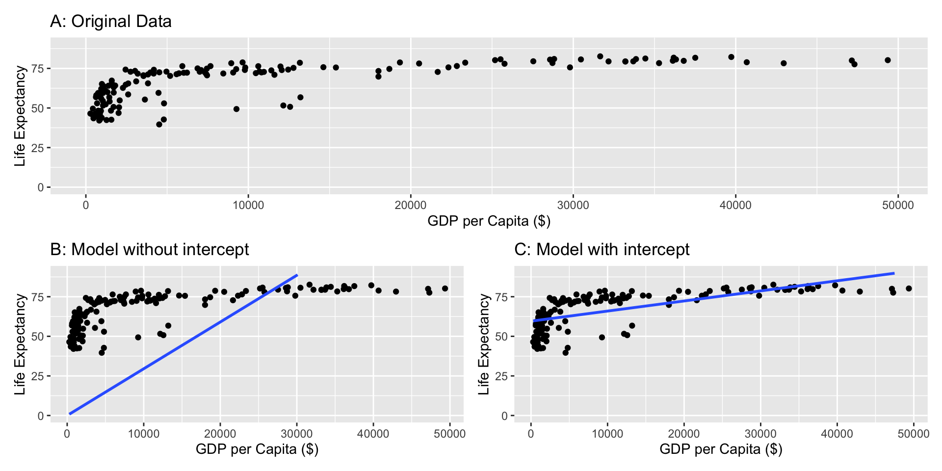 Imagine we want to test the relationship between GDP per Capita and Life Expectancy of countries in the world. Let’s compare a model without and a model with intercept: