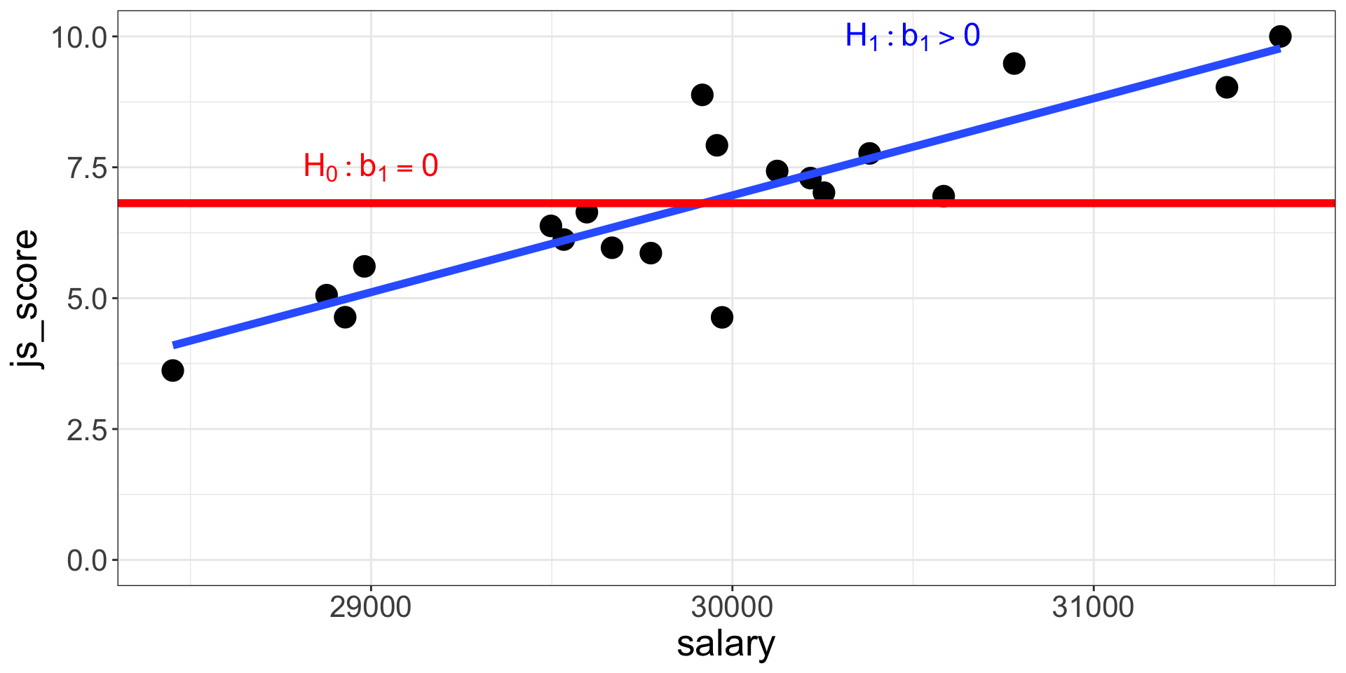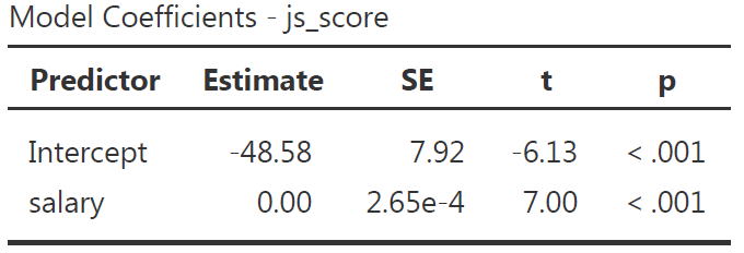 - \(H_{a_{1}}\): \(js\_score\) increases when \(salary\) increases (i.e., \(b_1>0\))