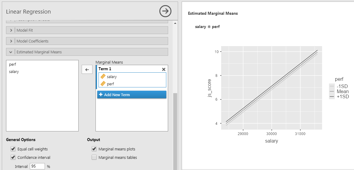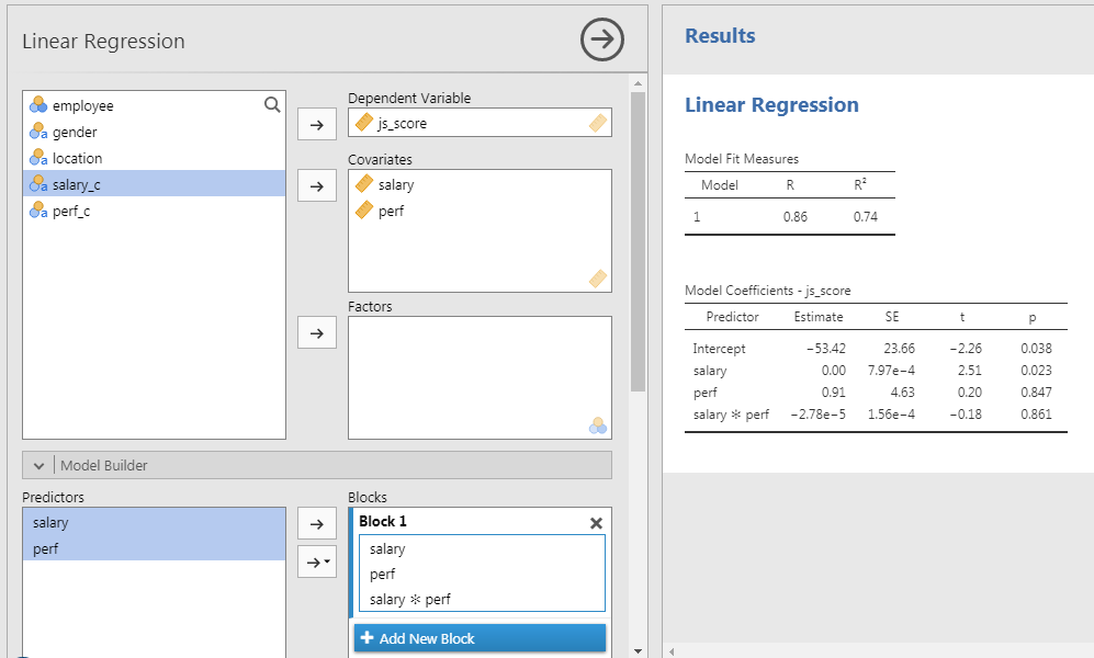 - Select both \(salary\) and \(perf\) to bring them in the covariates at once and to obtain a third term called \(salary*perf\)