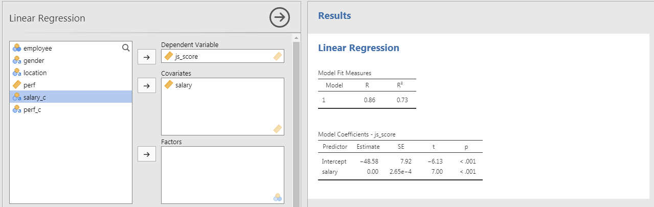 - Set \(js\_score\) as DV and \(salary\) as well as \(perf\) as Covariates