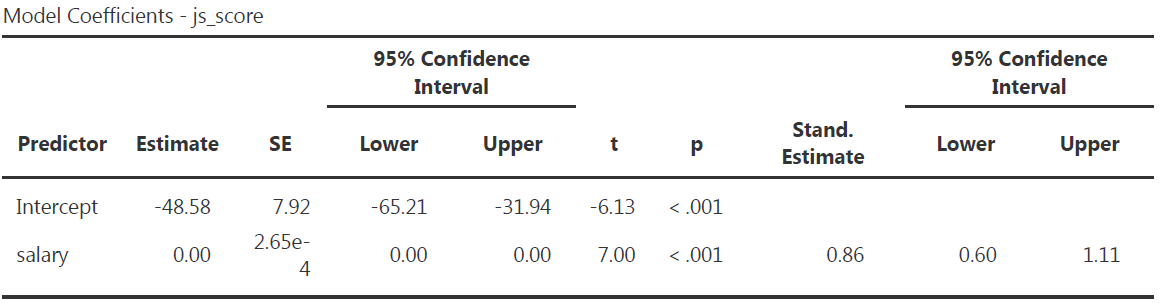 The effect of \(salary\) on \(js\_score\) is statistically significant, therefore \(H_0\) can be rejected (** \(b = 0.00\), 95% CI \([0.00, 0.00]\), \(t(18) = 7.00\), \(p < .001\)**).