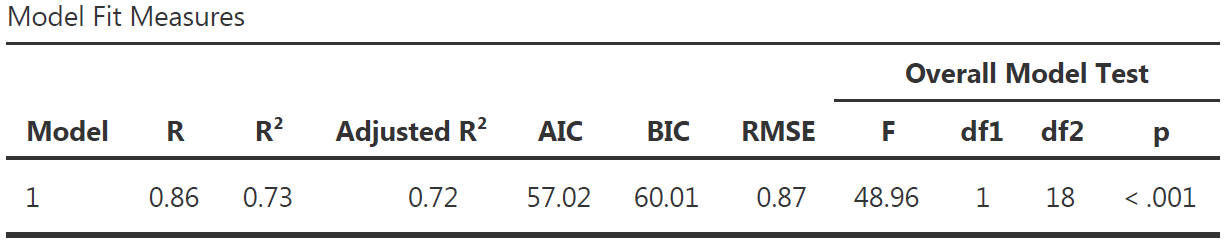 - The \(p\)-value in the Model Fit Measure table is the same as the one in the Omnibus ANOVA Test and in the Model Coefficient table
