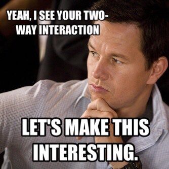 \(salary*perf\) is a two-way interaction but interactions can three-, four-, n-way such as \(salary*perf*gender\) or \(salary*perf*gender*age\). However the more complex the interaction, the more difficult to interpret its effect.