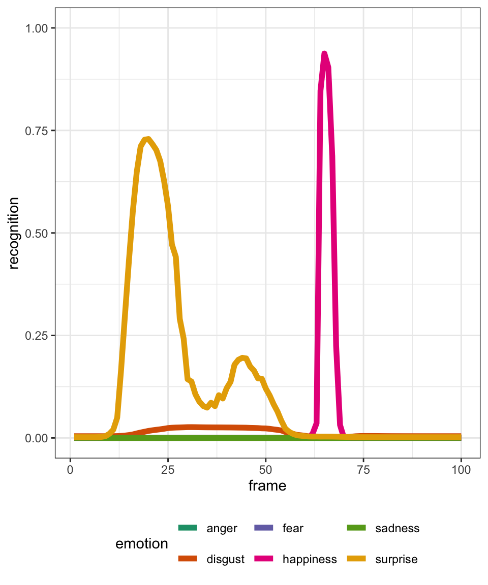 Each video frame was scored for the likelihood of expressing the following emotions: Happiness, Surprise, Disgust, Fear, Sadness, and Anger, with values from 0 (not recognised) to 1 (fully recognised).