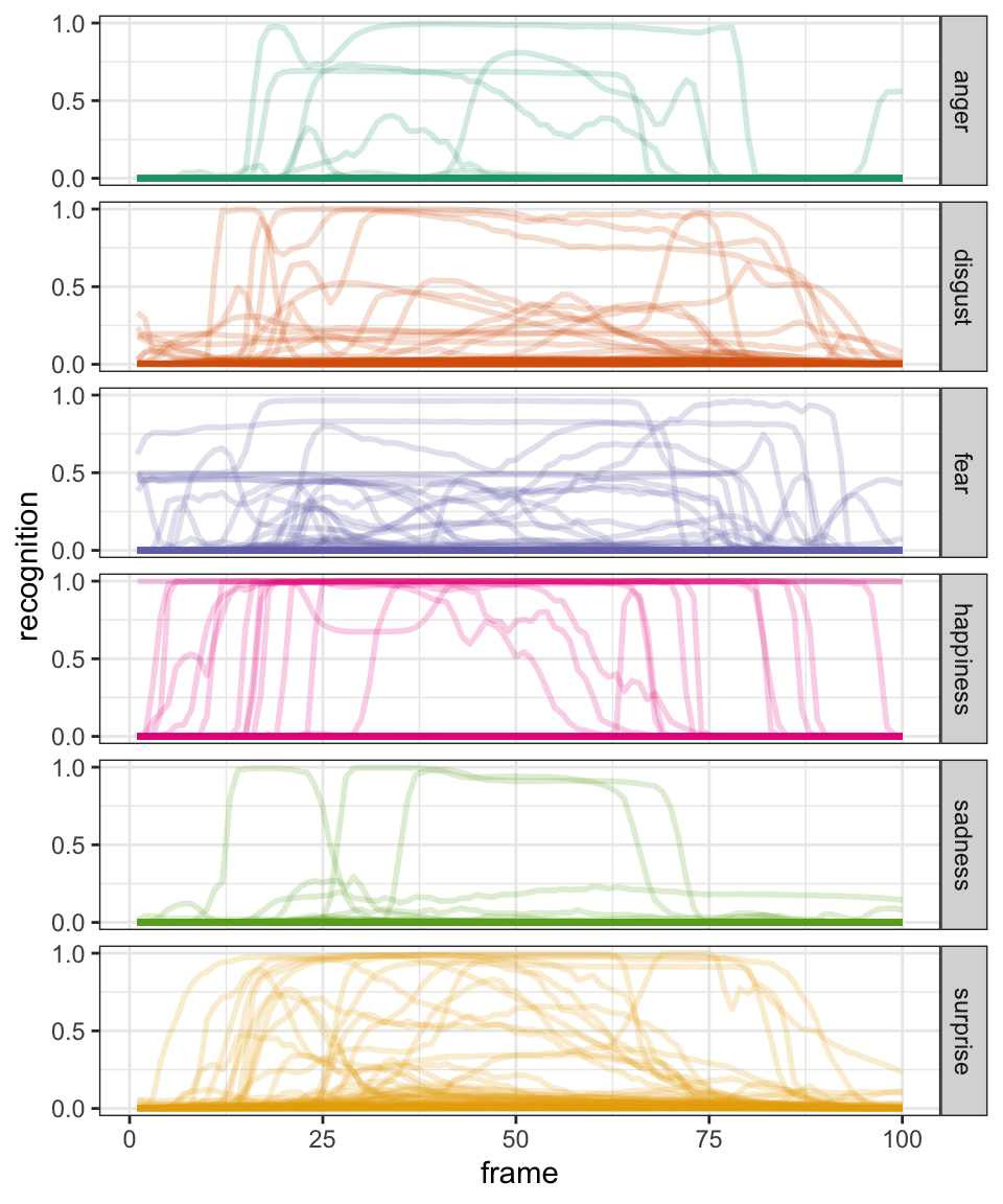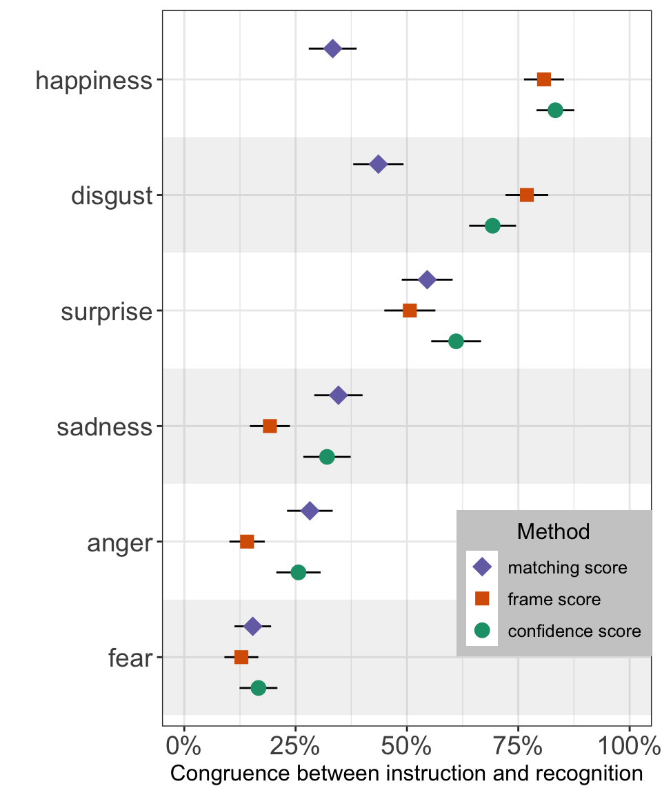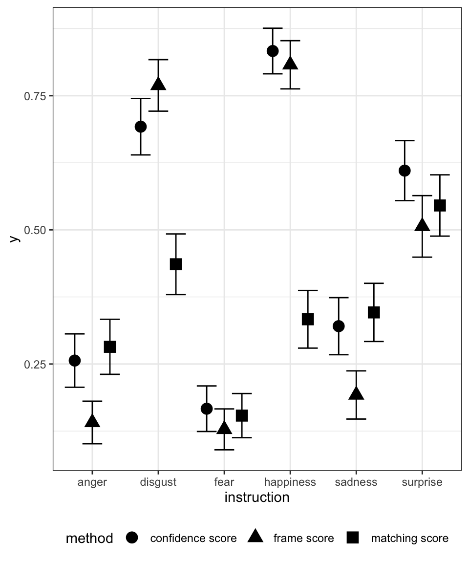 mutate(method = "frame score") # label the methodNow a label has been assigned to each recorded video using 3 different calculation methods, we can compare these score with the “ground truth” (i.e., the type of emotion supposedly elicited).