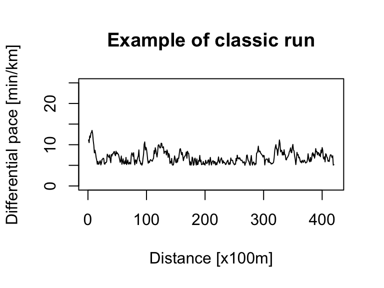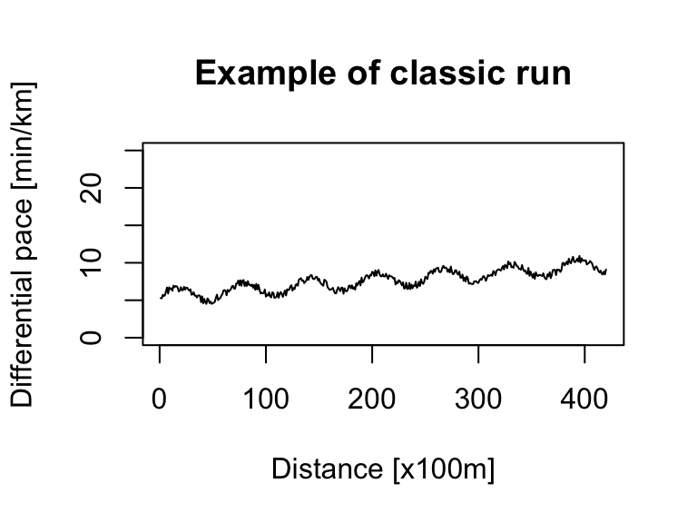 ts.plot(ts_sim_classic_run, xlab = "Distance [x100m]", ylab = "Differential pace [min/km]", main = "Example of classic run", ylim = c(0, 25))