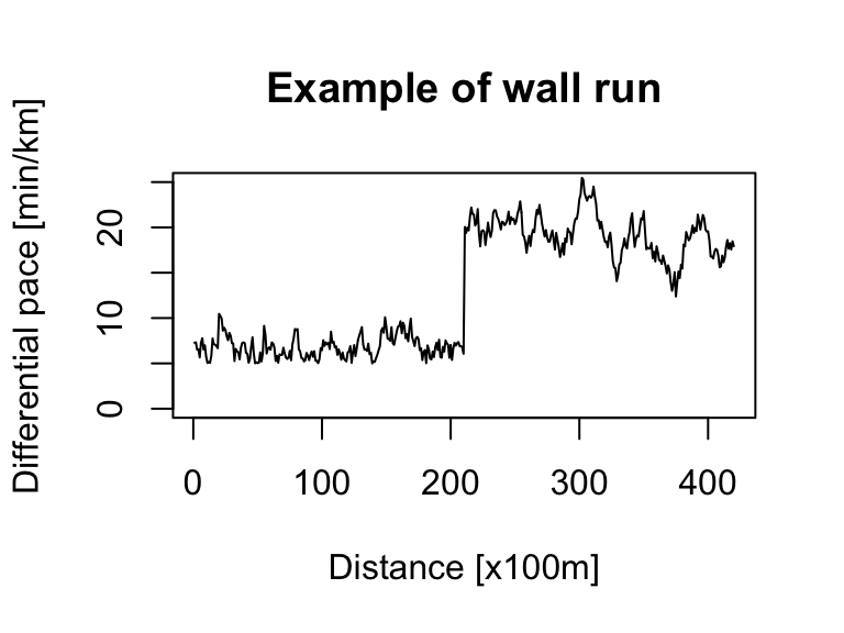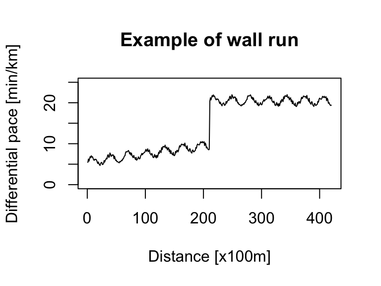 ts.plot(ts_sim_wall_run, xlab = "Distance [x100m]", ylab = "Differential pace [min/km]", main = "Example of wall run", ylim = c(0, 25))