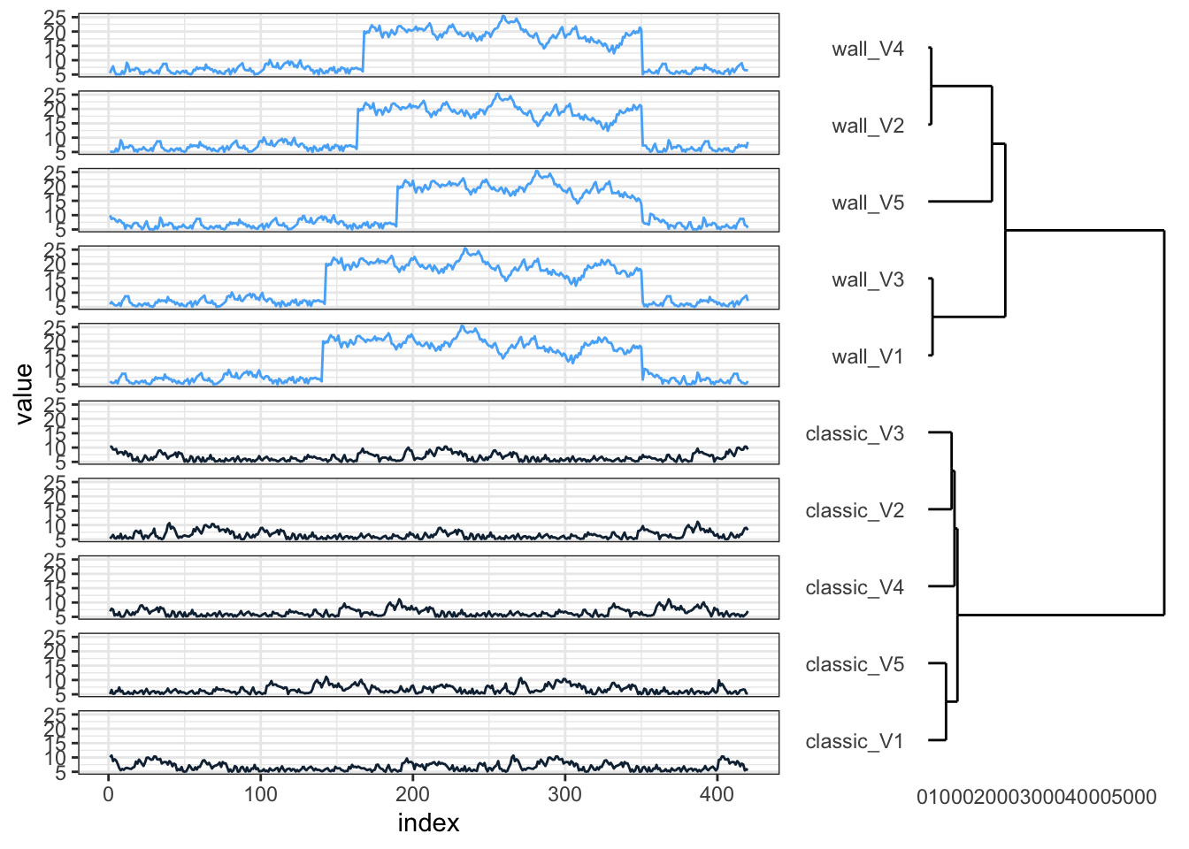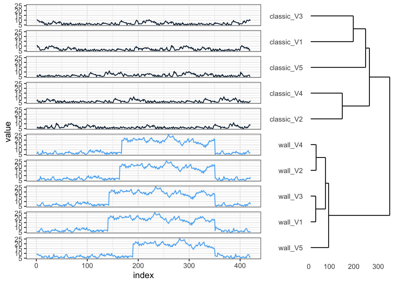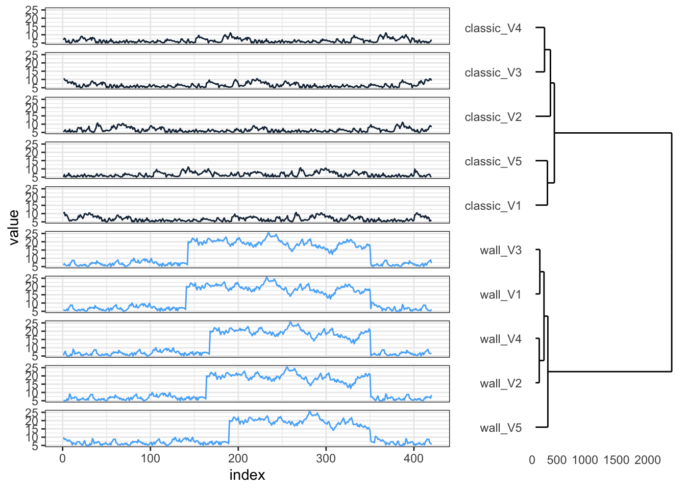 The heatmap already shows a clear separation between the ‘classic’ and ‘wall’ runs. But since our focus is on DTW, let’s move on to the {TSclust} and {dtwclust} packages.
