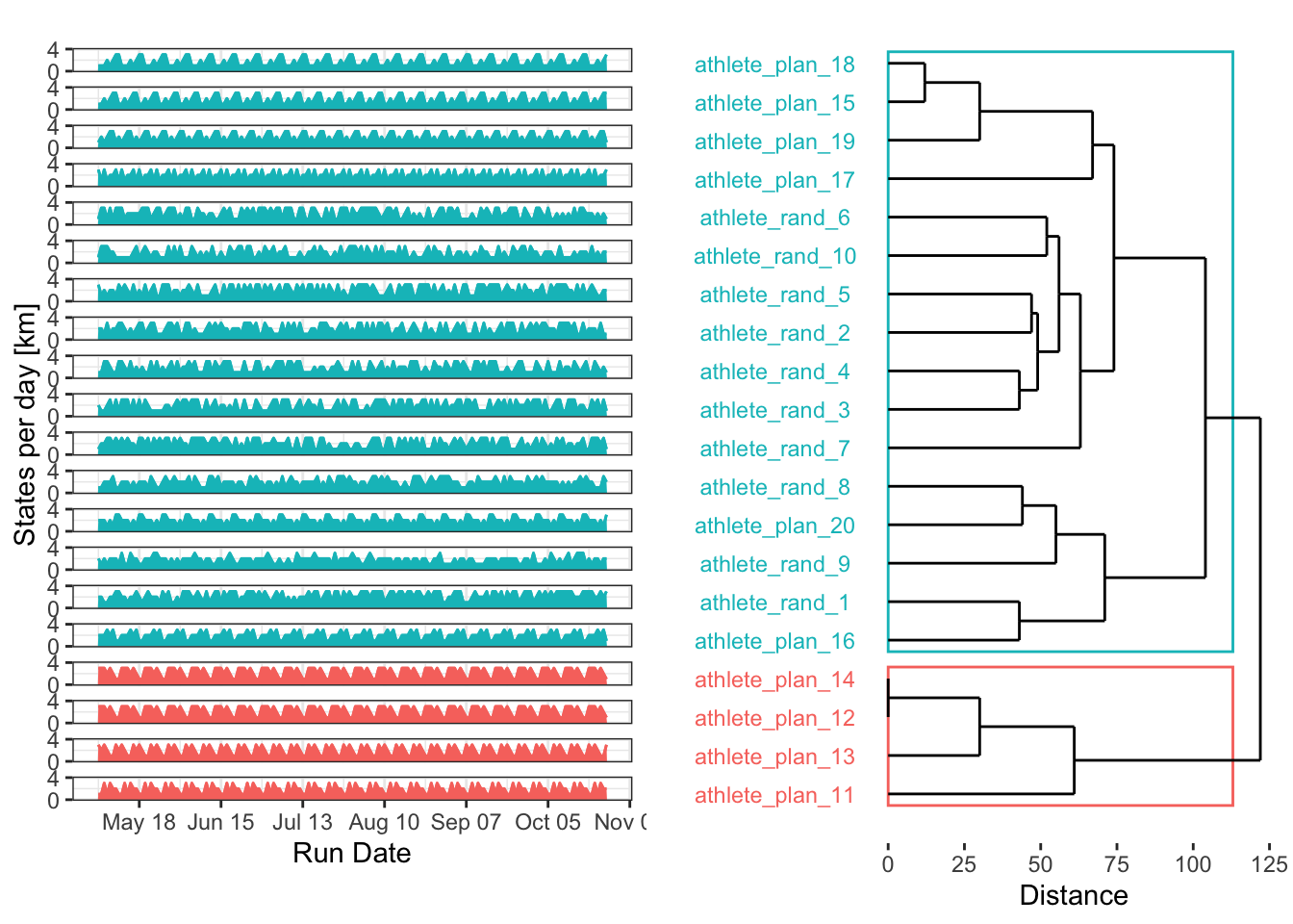 For this analysis, I’ll create a dataset of 20 simulated athlete training plans. Ten of these will be random, while the other ten will follow a repeating pattern, but with non-synchronized dates and intensities. The main variable is the distance run each day over the 25 weeks (175 days) leading up to the marathon.