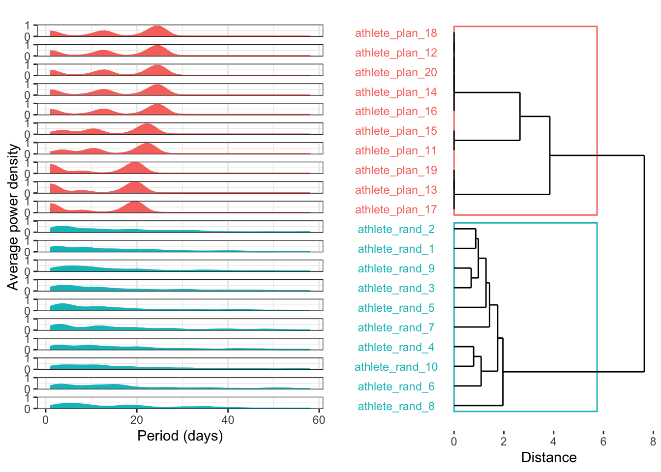 Last but not least, perhaps the best approach for evaluating seasonality in training plans is power spectrum analysis. By identifying the underlying frequencies in each time series, we can cluster them according to their dominant patterns. The excellent {WaveletComp} package is perfect for this, as it analyses the frequency structure of time series using the Morlet wavelet.