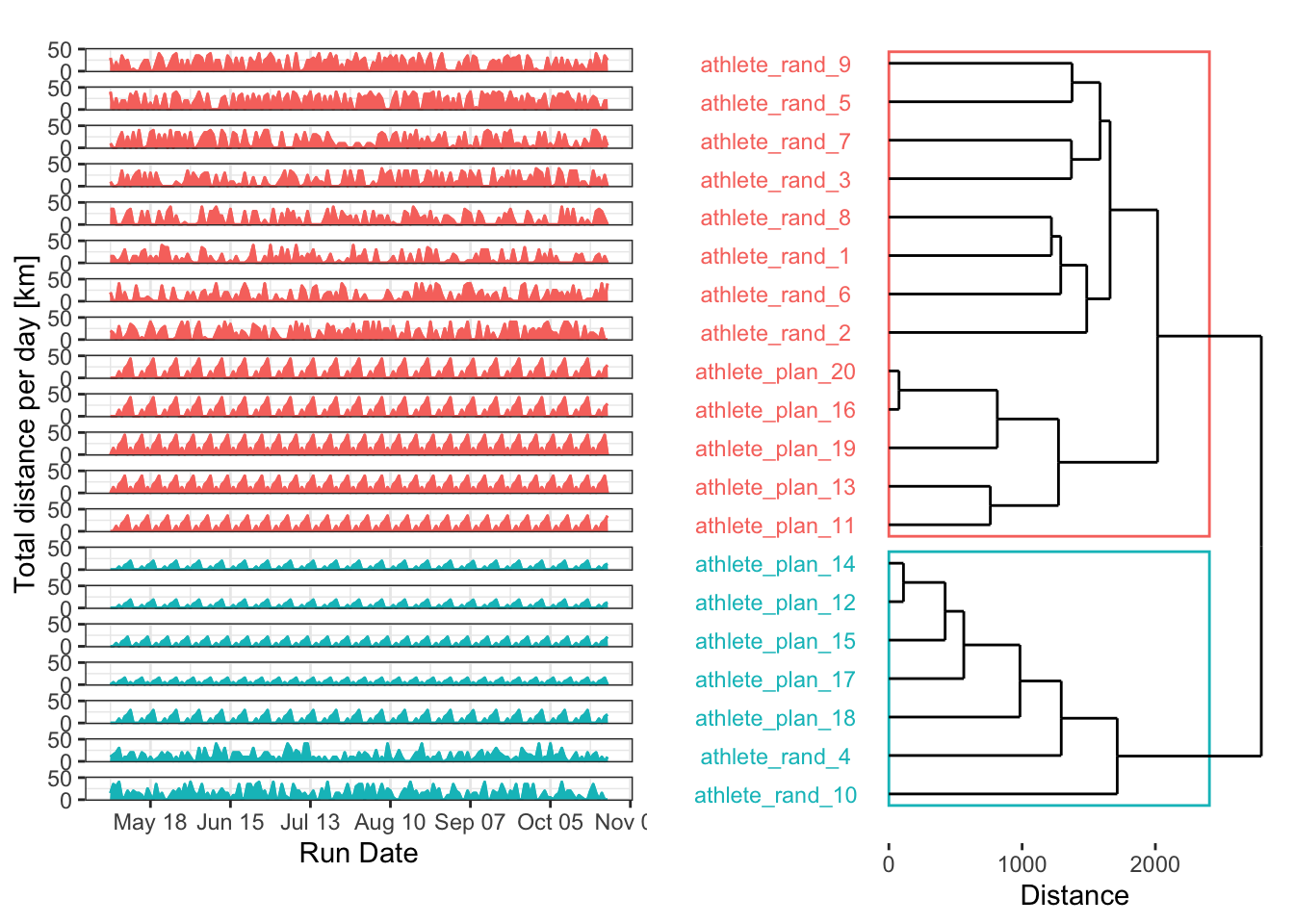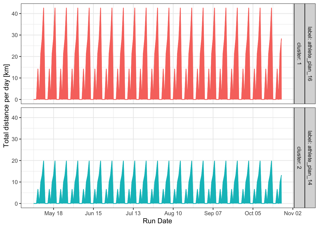 df # random training plan with runs from 5 to 40km with a high proability of non run days (between 25% and 75% depending on athletes)